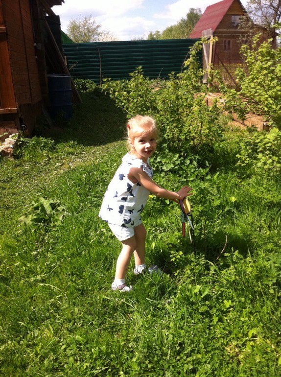 Накануне на прогулках с бабулей по дачам обзавелась ожогами ног от борщевика. Лечим волдыри теперь и ходим в штанах. Рост 112 (обгоняет меня и моего бр...