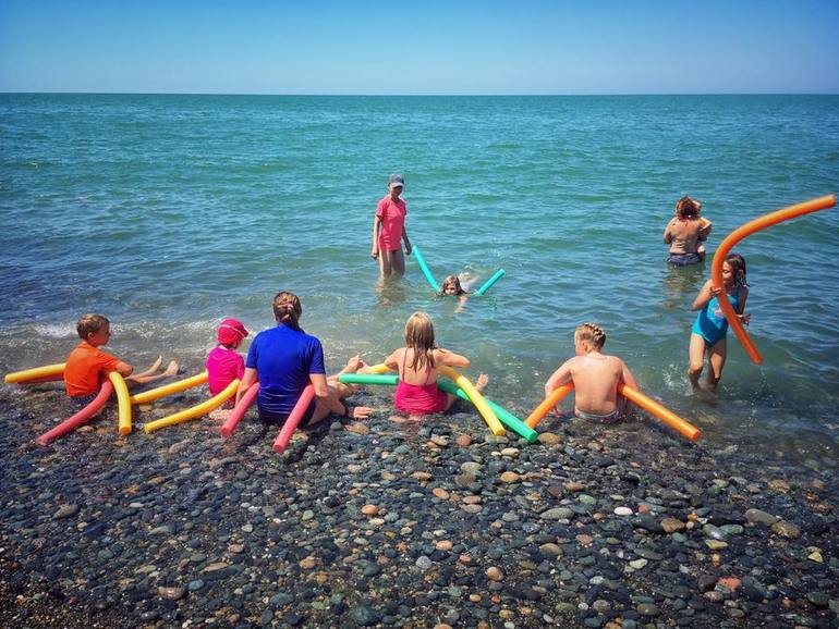 1. Занятие по плаванию. Ева с бирюзовым нудлом в море. Хорошо, когда в группе есть ребенок, который умеет и любит плавать. Глядя на него другие детки вдохновляются и тоже заходят в воду, знакомятся с водой, преодолевают свои страхи и тоже начинают учиться.