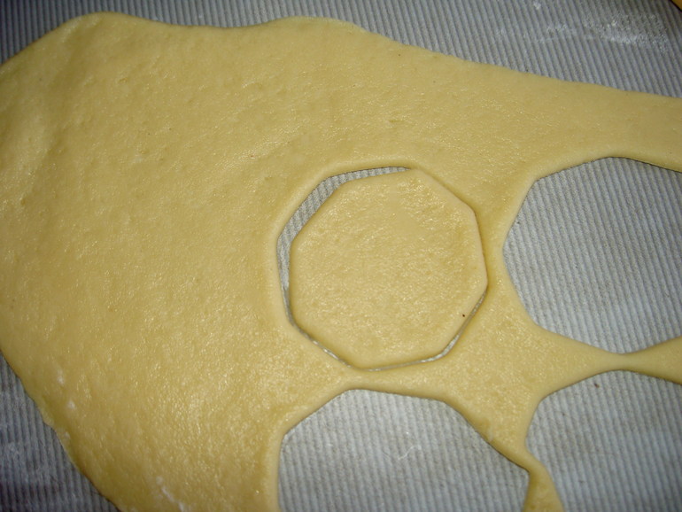 Раскатать тесто толщиной не менее 0,5 см. Лучше толще. Вырезать формочками коржики. У меня не было подходящих формочек, поэтому вырезала стаканом.