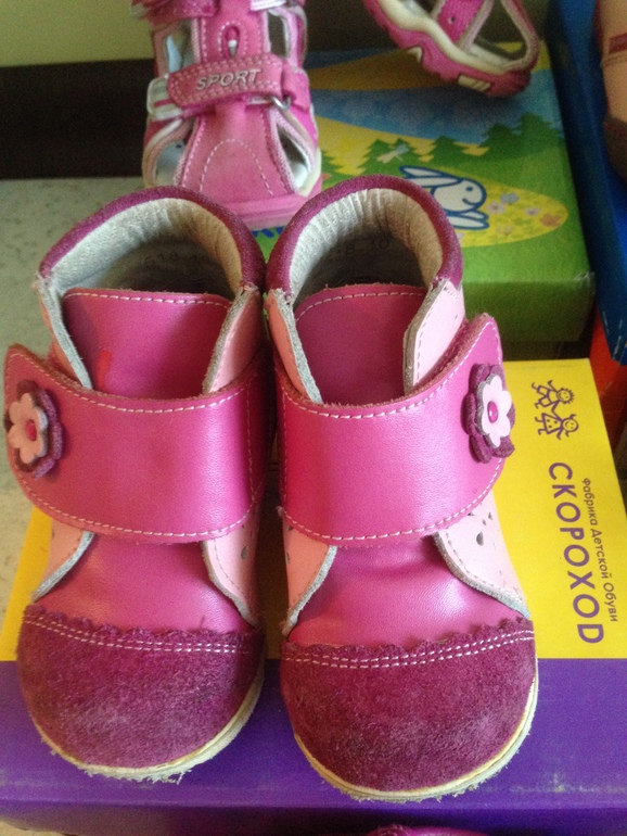 4) Ботиночки на первые шаги «Скороход» фиолетово-розовые, замша+кожа натуральная, 19 размер (по стельке 12,5 см) - 600 рублей;