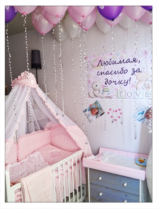 За нами приехали папа, Паша и Саша. Дома нас ждал сюрприз. Невероятно красиво украшенная комната шарами, плакатом "любимая, спасибо за дочку" и фотками малышки. Я была тронута. А в память об этом дне мне любимый подарил кольцо, которое я на совершеннолетие передарю дочке.