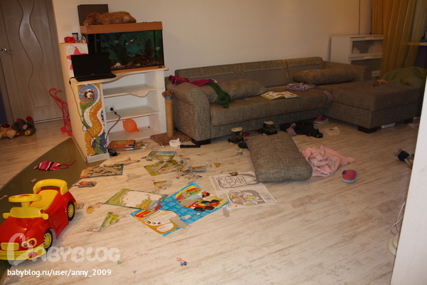 ООО я думала это у нас такой беспорядок!! Я даже и не навожу идеальный опрядок. БЕЗПОЛЕЗНО! только на ночь игрушки по местам, порванные бумажки в ведро и когда есть возможность мою полы. и все.