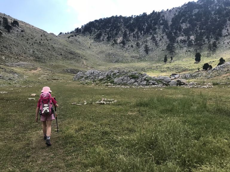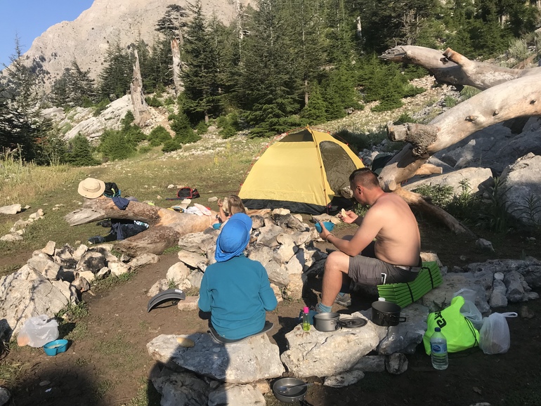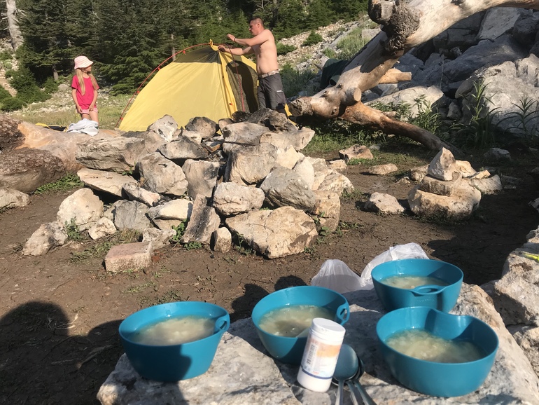 Встали пораньше, в 8 вышли. Поднимаемся по тропинке, выше и выше... в деревеньке Яйалакудзере отдохнули, магазинов и кемпингов там нет, у местных купили хлеб, угостились черешней, обобрали тутовые деревья, переждали жару. Сегодня мы поднимаемся под перевал, дошли до плато... такая ровная поляна, с огромными камнями окружённая чередой гор. Кукуряйла, такое название, здесь домик пастухов , и большущее хозяйство.Мы остановились не доходя...Волшебное место вокруг вековых листвениц, окружённое скалами, как в уютной комнатке!Вход в палатку на восток, мечтаю увидеть рассвет)))