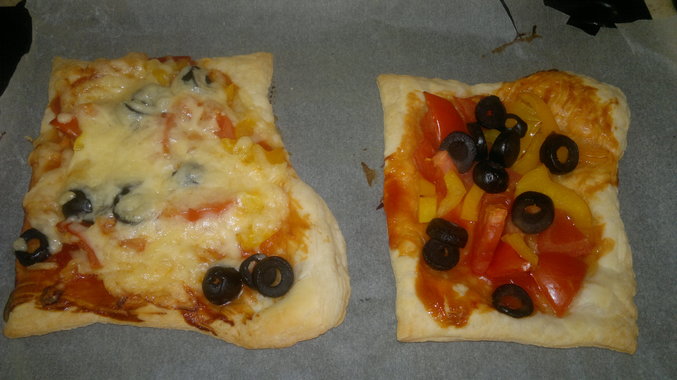 Считаю его лучшим тестом покупным! Раскатываем тесто тонко) Малой активно помогал скалкой, молодчина маленький ;) Режем на 4 части тесто, смазываем кетчупом каждый кусок, а дальше полет фантазии или ограничения клму что можно. У нас было две постных пиццы и две не постных) Еще папа с работы придет, мы и ему сделаем горяченькие сразу же ;)