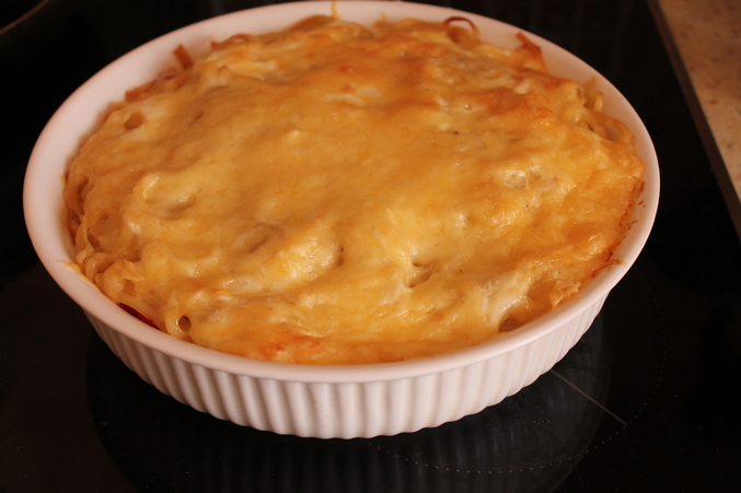 У меня были спагетти. Далее в ёмкость складываем - слой макарон, затем или помидоры в собственном соку или свежие помидоры очищенные от шкурки + я режу ещё мелко шампиньоны из банки и перец сладкий немного. Я делала запеканку под мясное блюда, так что у меня фарша внутри не было. Если делаете отдельно, то кладёте фарш туда же... Далее слой из макарон опять . Сверху смазать сметаной или майонезом нежирным. Кому как нравится. И полить это всё сливками+2 яйца (смешать, взбить немного венчиком..) Сверху трём сыр и в духовку на 15 минут. Я сразу на 15 минут закрываю фольгой, а потом ещё 10 минут открываю фольгу чтобы подрумянилось немного ;) В духовке получается в общей сложности минут 25-30 при 180 градусах. И получается супер вкуснота!!!