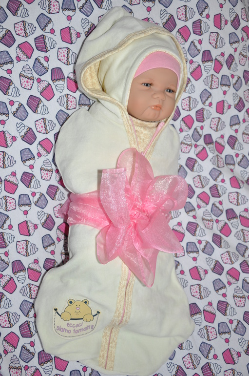 Состоит из слипа, шапочки-луковки, слюнявчика, царапок, велюровой шапочки на подкладке, велюрового кокона на подкладке. Также дополнен гипюровой лентой, которую можно сформировать в красивый бант. Комплект можно использовать как для прогулки теплыми весенними деньками и прохладными летними вечерами, так и для выписки из роддома.