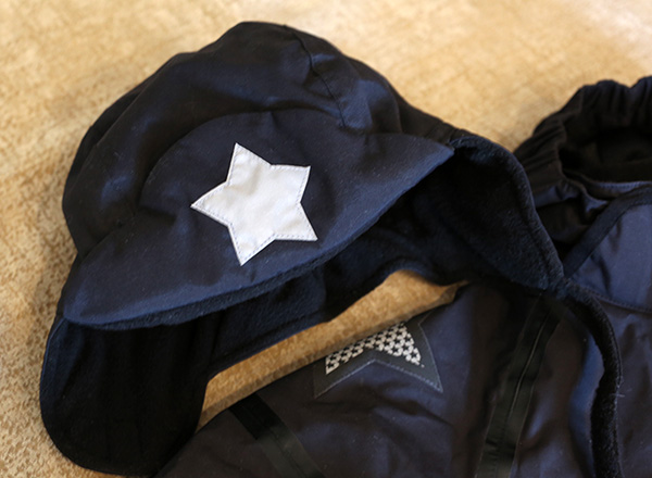 Шапка .) тоже со звездой-отражайкой, на флисе, при желании уши соединяются под подбородкой лентой на липучке. Размер 3-4 года.