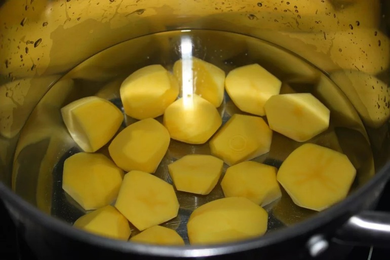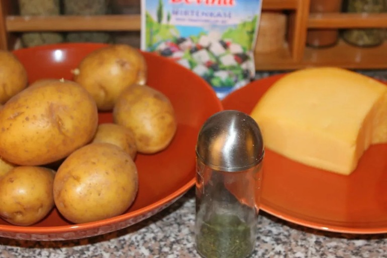Из готового картофеля сливаем всю жидкость и делаем пюре, с добавлением оба видов сыров