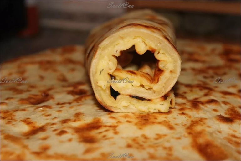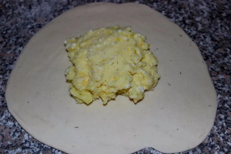 Раскатываем лепёшку, выкладываем начинку (начинки должно быть больше чем теста)