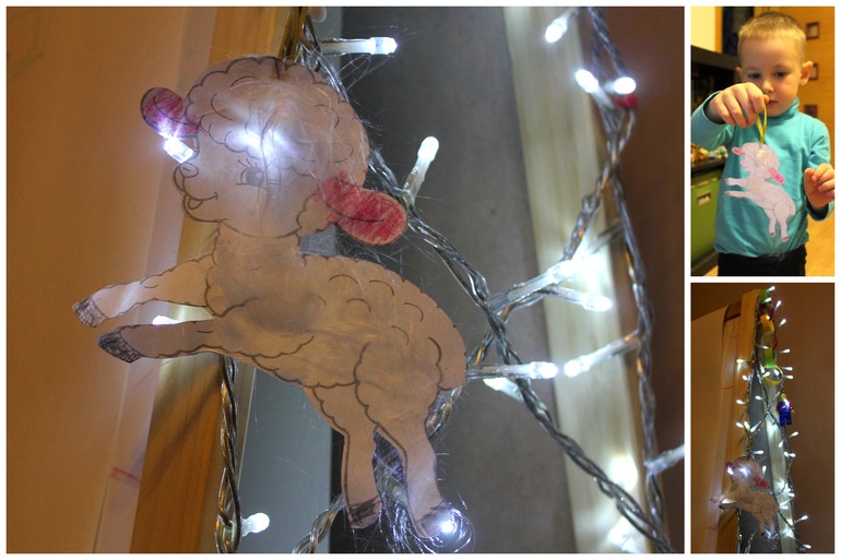 Рома на развивашках сделал вот такого милого ягнёнка и повесил его на нашу "ёлку"