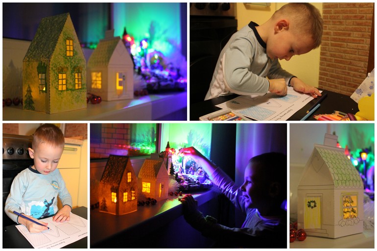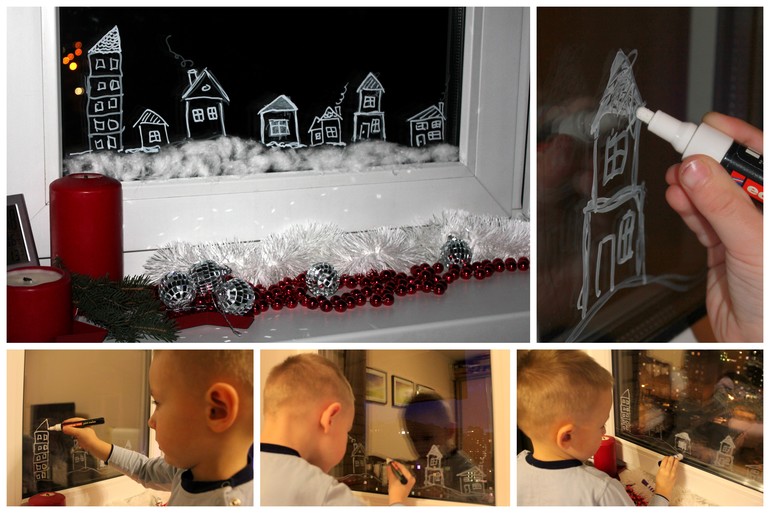 Мы начали украшать окно, поставили на подоконник "музыкальный городок" и разрисовали с Ромкой два домика. Получается симпатично)