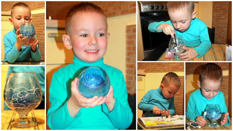 Вот готовим еще один подарочек. Взяли бокал и изнутри разрисовали, точнее изкалякали) маркером. Затем намазали клеем и обсыпали блестками, трех тонов, с переходом от темного к светлому. Ну а потом как обычно, порезали свечки, расплавили и залили в бокал. Расплавленный парафин тоже подкрасили в синий цвет, просто добавив кусочек воскового карандаша. Плюс ароматизатор. В результате получилась замечательная зимняя свеча!