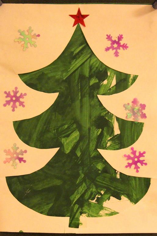 И снова поделка с развивашек. Смотрится симпатично, а сделать просто. Сперва разукрасили лист зелёной краской, сверху наложили трафарет с вырезанной ёлочкой, ну и украсили звездой и снежинками. Отличная идея, как сделать аккуратную поделку с малышами.