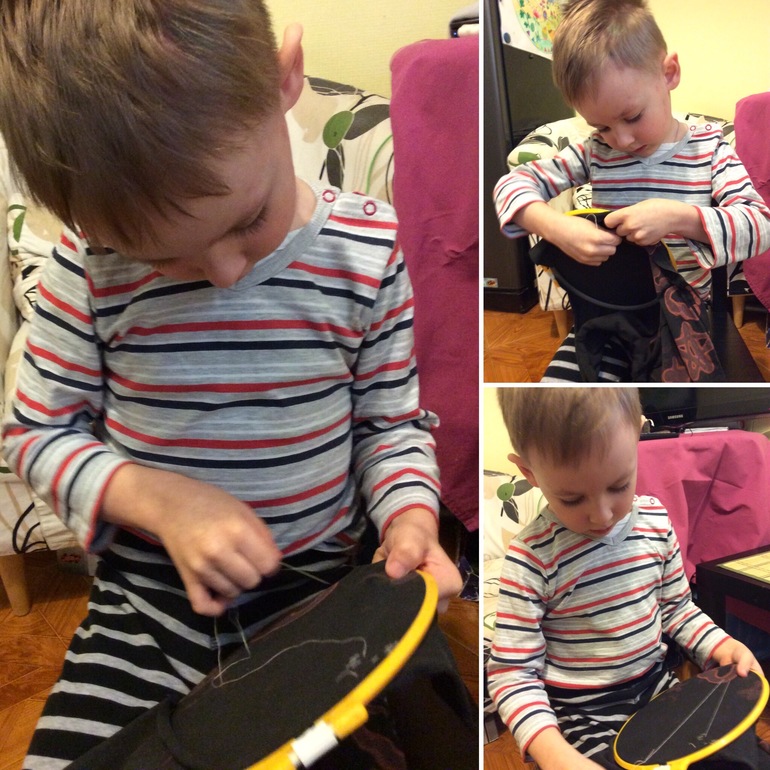 Сегодня взялись за иголку! Сперва для удобства вышивали на прозрачной ткани. Для безопасности купила самую большую штопальную иголку. Ромка так увлекся, что потом еще и на черной ткани без моей помощи практиковался!