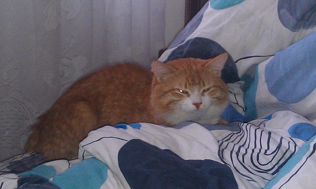 Похоже,у меня не только самый капризный ребенок сегодня,но и капризный кот.Снял покрывало с кровати,взбил одеяло и прилег отдохнуть.Тут я его и застала.Сделал вид,что меня нет.