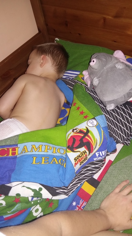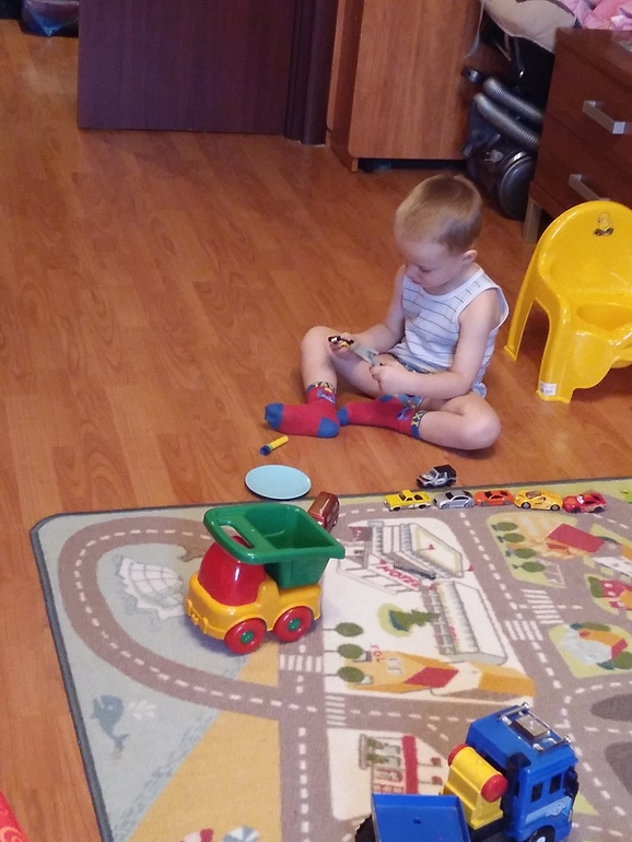 Фразами и предложениями простыми. Иногда уже всё понятно. Как и раньше, любимые игрушки-машинки. И СЛОН)Папа из Испании привёз давно-давно, Сёма его на прогулку одевает, кладет в коляску к Алесе, дома переодевает,на ночь раздевает и кладет с собой. Сейчас у нас ролевые игры в ходу. Сёма говорит,что он айтер (мастер), берет молоток и машины "ремонтирует". "Снек" на улице очень ему нравится, а в прошлом году ходить не хотел по нему)))