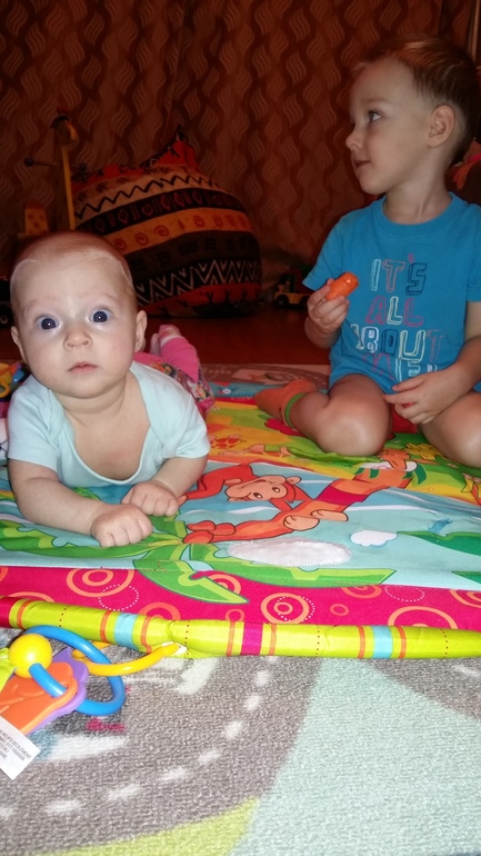 Одна предпочитает не лежать, о своих желаниях и нежеланиях всех извещает громким визгом. Руками машет, ногами дрыгает. Руки ноги пока никак не достанут,но очень хотят. Игрушки из лблого положения в рот затаскиваются.