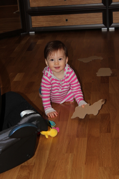 Пару раз самостоятельно без опоры пробовала ходить - сделала пару шажков. Учится стоять без опоры. Ходит за руку, подмышки и опираясь на стул.