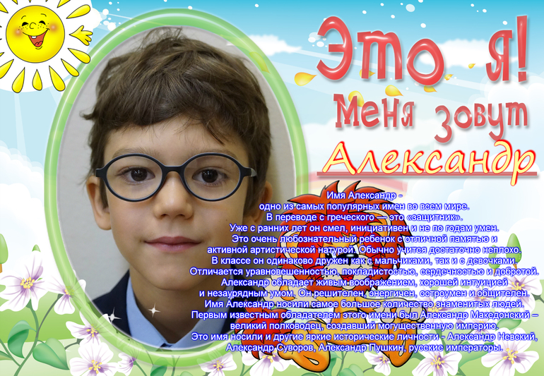 В двух словах. В среду на классном часе Сане нужно рассказать о своем имени. Потом это пойдет в его портфолио, поэтому надо все красиво оформить. Текст есть, его фотка есть. Нужен шаблон, чтобы все это вставить. Все, что я нашла, какое-то детское и в основном в горизонтальном формате) А надо в вертикальном и что-то в более мужественном виде, все-таки Александр в переводе означает "мужественный защитник". И мне хочется связать его имя с Македонским или Невским))