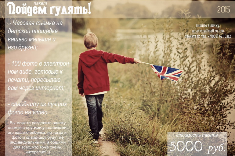 Всем привет! Пока у меня не начался свадебный сезон, ай-да гулять с малышами! ;) Еще на макушках смешные весенние шапочки, еще только просыпается природа и дети искренне удивляются и радуются новым открытиям, новые игрушки после зимы выходят в свет, а песочница начинает свой долгий веселый сезон. Непременно надо оставить об этом память! Первые друзья, первые шаги, первые попытки освоить велосипед или ролики, первые ссоры из-за лопатки и первые порванные штанишки ;). Ваша задача смотреть, как радуется весне ваш малыш, моя - оставить эту радость в память для него самого. Зовите меня для своего крохи, зовите для дружной компании. Но только в Бутово! В будни я с вами! ;) Пока!