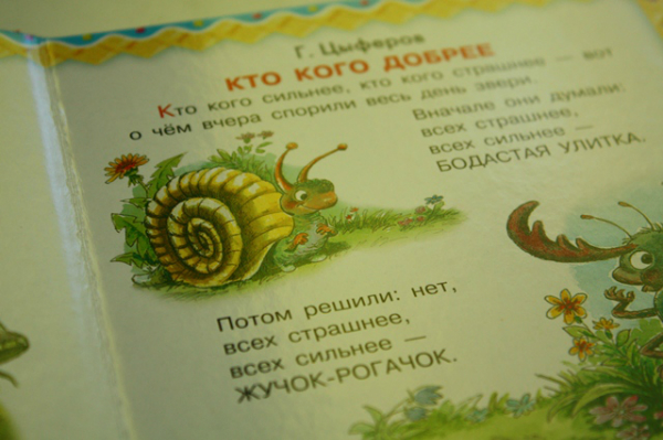 Из лучших побуждений - воспитания любви и бережности к нашей Шпуньке не могли пройти мимо этой книжки. Опять таки детские стихи и совершенно не детские илюстрации в акварели. Мне кажется малыши обращают внимание на контрастные, четкие контуры... тут с этим могут быть проблемы. Так что это книжка больше для нас с Тимкой, наверное ;)