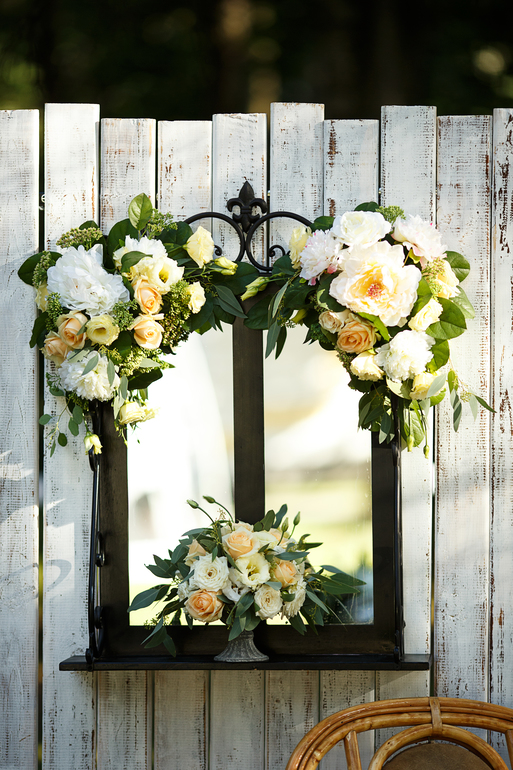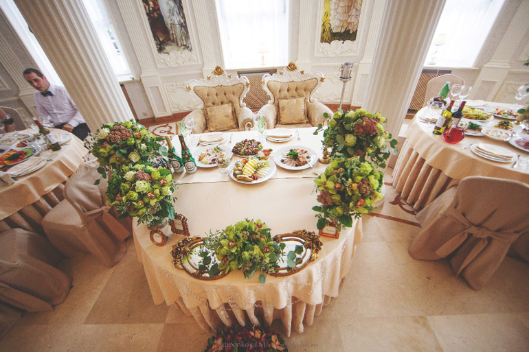 Марина и Михаил выбрали для первого праздника своей семьи красивейшую усадьбу конца XIX века. Торжественная регистрация проходила в старинных залах, банкет - в просторном шатре, а фотозона и зона отдыха - на территории парка. Марина хотела, чтобы все было нежное, воздушное, со светло-персиковым оттенком. Михаил - чтобы обязательно присутствовала монограмма из первых букв их имен. Остальное было придумано в процессе совместных обсуждений и реализовано нашей студией.