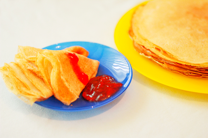 Что и решила исправить сегодня! Напекла блинов на новой керамической сковородке. Такие классные, тонкие и кружевные получились :) С клубничным джемом вообще ням-ням :)