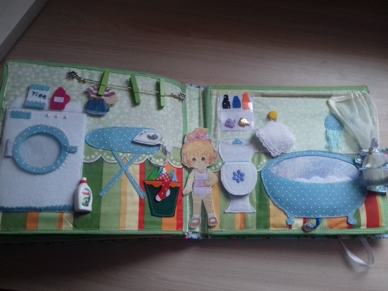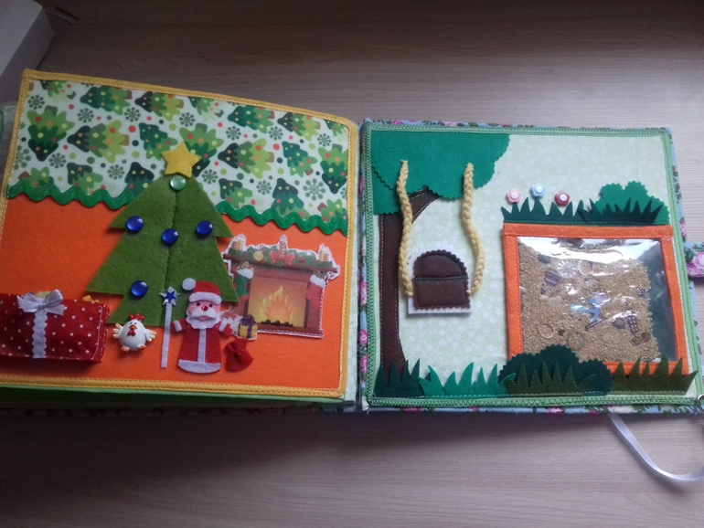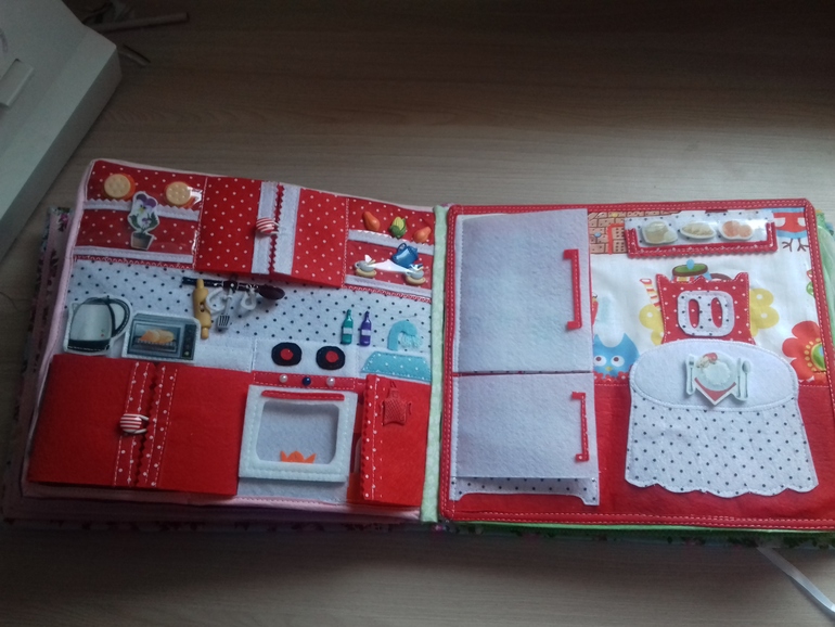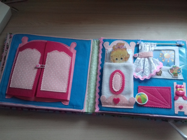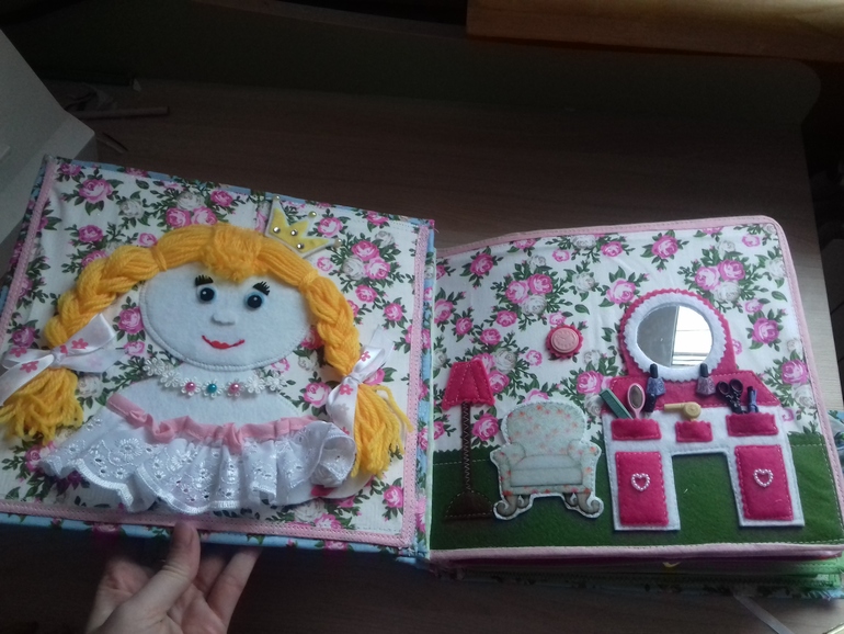 Старшая дочка тоже попросила сшить ей книжку...и вот она закончена... Так как с книжкой будет играть не только старшая, но и младшая дочка, несколько игр в книжке сделала для неё: геометрические фигуры, песочница - искалочка и т.д. Все элементы в книжке, куколка, одежда, еда и т.д. - из фетра.