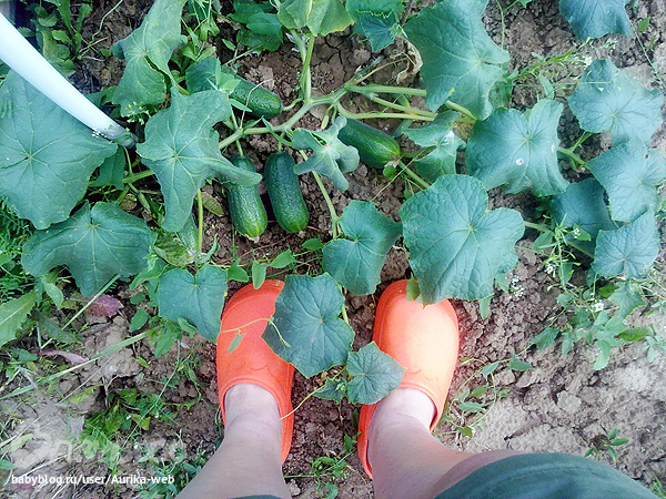 Нас не было неделю и за это время не было дождей. Огурчики выросли, листочки повяли. Я их хорошенько полила и они ожили.