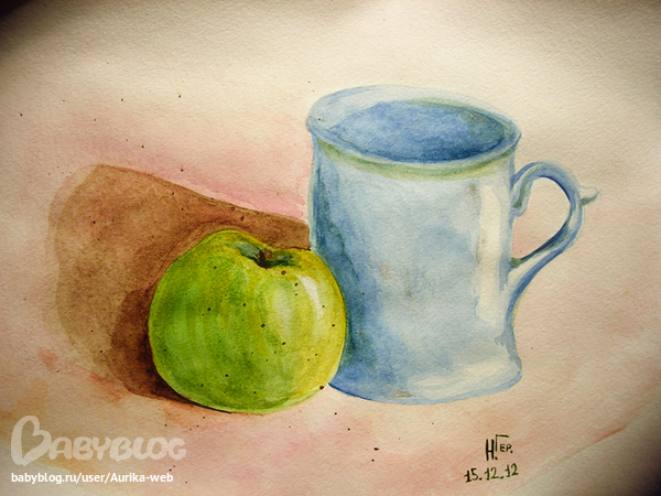 Два раза рисовала этот натурморт. Это вторая попытка. Никак не получались складки и тут что-то похожее на них уже получилось. На первом варианте вообще ужас. С тенью перебор.