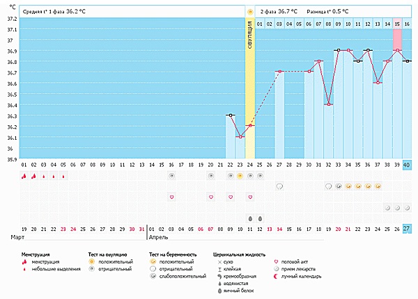 Вот мой график. Даже как-то жаль, что с самого начала не стала мерить БТ. Ради интереса хотя бы. Не понимаю что за полоска розовая на 15 день 2й фазы цикла. Может это день Х прошел? Ещё не понимаю почему некотрые точки с чёрточками чёрные, а не розовые.