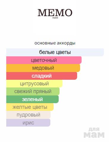 Богатая и насыщенная цветочная композиция Memo Ilha do Mel с медовыми оттенками была создана парфюмером Alienor Massenet из IFF и строится вокруг трех основных нот: цветов дрока, ягод можжевельника и ванили. Насыщенные ароматы белых цветов в сочетании со сладкими аккордами дополнены другими выразительными и разносторонними цветочными акцентами, а также сочетанием умеренных цитрусовых нот и оттенками освежающих специй.