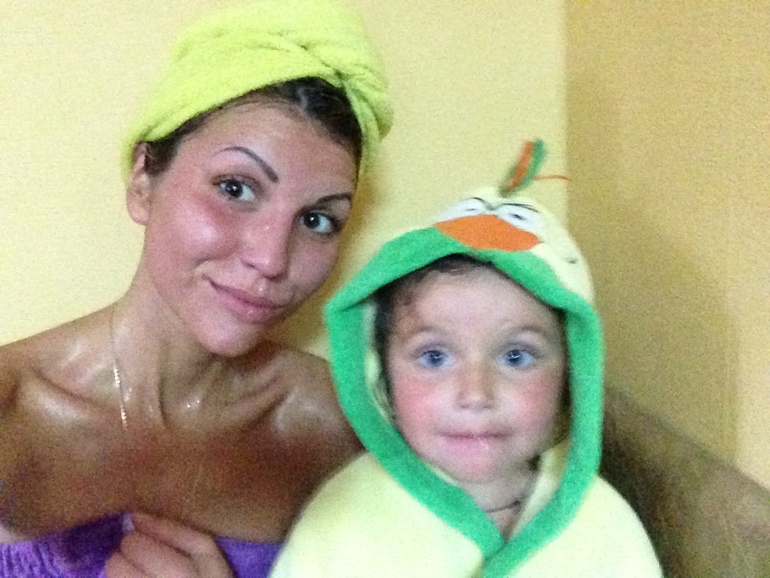По воскресениям у нас баня, традициям не изменяем, Элина с большим удовольствием ходит со своими игрушками в турецкую с паром и русскую с веничком!!!