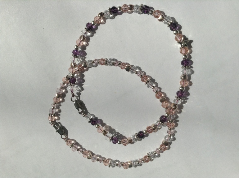 Натуральный жемчуг, аметист, бирюза, лазурит, яшма, коралл;) кристаллы сваровски))) люблю вас)) только вот на браслет уходит в среднем минут 45) а еще если руки кривые и расстрается все на стадии закрепления замка-хочется выть)))сегодня сделаю себе и Авроре браслетики на ножки))