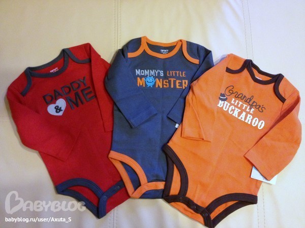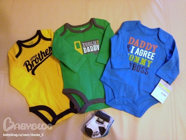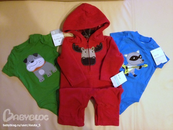 Ну что сказать...соблазнили меня Carters(ом). Не удержалась я и заказала нашему малышу, когда еще дохаживала с ним последние денечки ноября. Заказывала на их официальном сайте, безо всяких там посредников и совместных закупок. Мой первый заказ в зарубежном интернет-магазине. Оказалось все легко и просто. При заказе свыше 3200 руб. доставка из Америки обошлась в 600 руб. Доставили быстро, за неделю, привезли все на дом. Качество очень хорошее, хоть и пошито в Китае, просто пошив фабричный, а не кустарщина. В общем и целом я довольна. Пока еще любуюсь, так как не доросли))) и только носочками уже вовсю пользуемся. Фото под катом, если кому интересно.