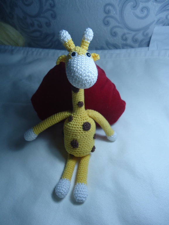 Связан на подарок. Есть брат-близнец,жираф Жора для Анюты, но он не захотел фотографироваться(Алиса не дала сфоткать). Высота вместе с рожками 19см.
