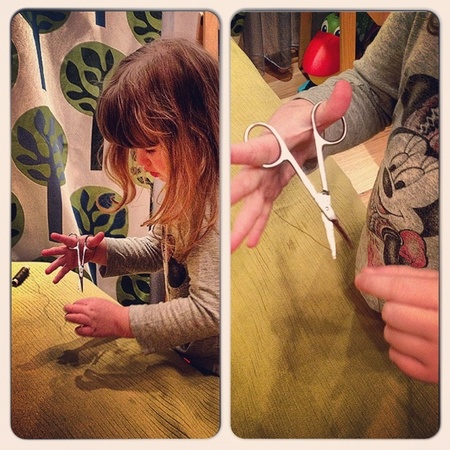 Смешно играет в парикмахера, восклицает:" Нииииткиии, не бойтесь, я вас спасуууу!" И режет их)))))