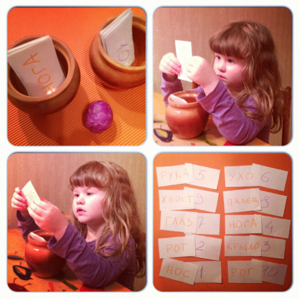 Правила игры такие: нужно написать на кусочках бумаги десять частей тела и цифры от 1 до 10.