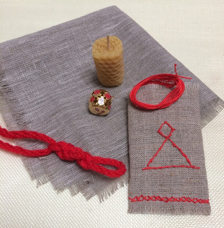 Для решивших это сделать, можете все составляющие собрать самостоятельно. Внешний вид может отличаться от моих, но свеча - нат.воск, Ткань лен или хлопок, можно мешковину. Нитки хлопок, для узла хлопок или шерсть( шерсть лучше). Бубенчик любой, можно которые для рыбалки,