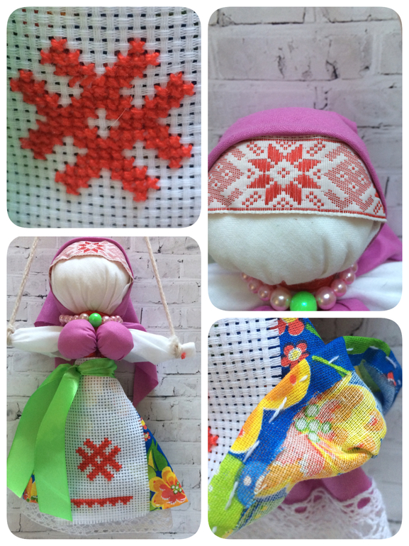Эта, например сделана на можжевеловых веточках. Это основное направление - мудрость в семейных делах. Что бы ладилось с мужем у которого сложный характер, сосна - богатство, осина - оберег от травм и сглаза. Рябина радость и хорошее настроение, клён / здоровье. Кроме этого есть много символов. Каждый стежок на одежде - символ.