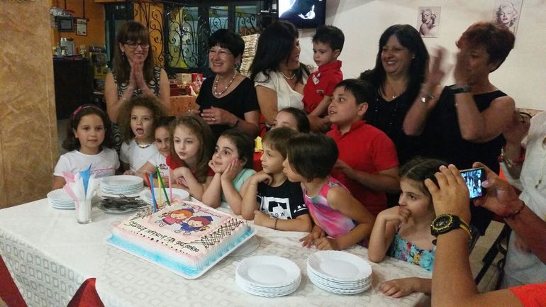 Хочу написать как у нас дела . В конце июня у Алессии был выпускной в саду, выдали дипломы и дети с родителями ходили в пиццерию.Воспитатели подарили выпускникам большой торт и кучу приятных воспоминаний ! Где-то на фото видно даже Мотю.