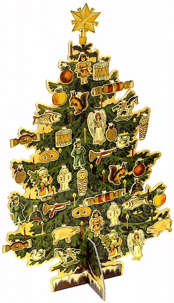 Внутри большая сборная модель елки из плотного-плотного ламинированного картона, а к ней елочные игрушки из картона потоньше и карточки для игры в лото с этими самыми украшениями. Да еще и книга о Рождественском Деде в придачу. Книга махонькая, да тонехонькая, но зато какая)