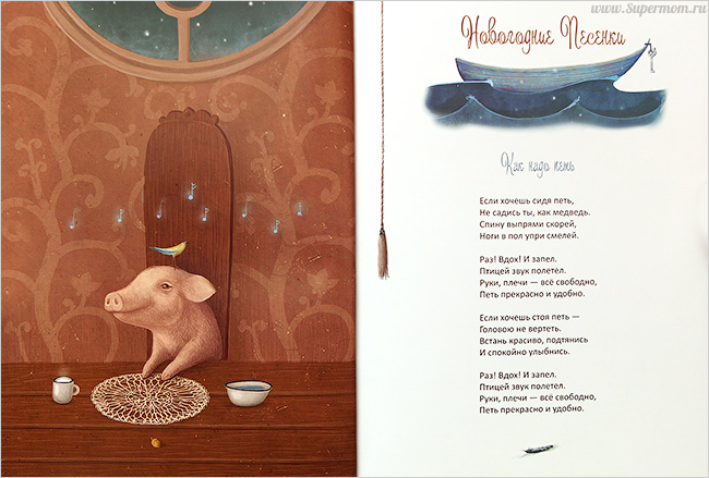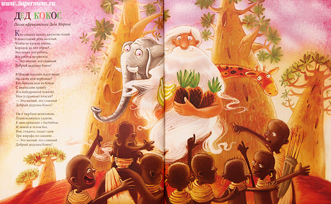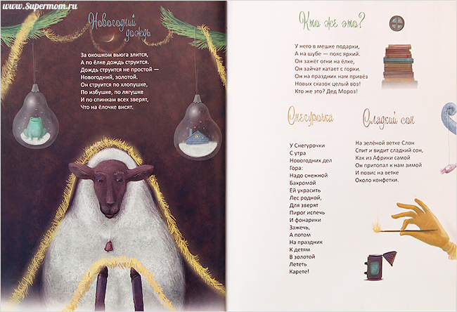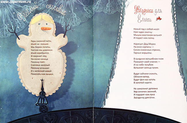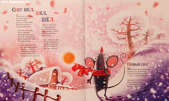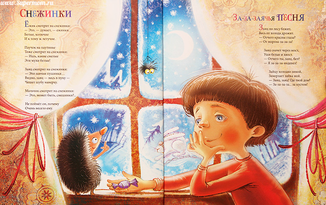 Попадание стихов - примерно два из трех. В подборке из 17 произведений - пара пока непонятна малышам, одно мне категорически не нравится, и еще одно опять докинули до кучи, потому что оно про Масленицу. Но несмотря на это, книга хорошо вписалась, с ней приятно расслабиться и отчеканить вечером несколько стишков, чтобы вместе похихикать и пообсуждать снежинки-ежинки и деда Кокоса, который приходит к детишкам в жарких странах.