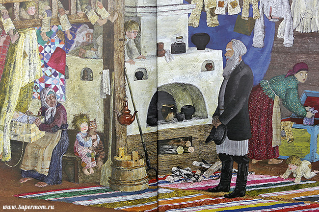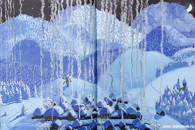 В этом году Алиса очень прониклась этой книгой. Она просит ее читать, просит рисовать по ней картины, ей нравится обсуждать иллюстрации - это все появилось к трем годам. И я очень рада, что ей тоже нравятся эти иллюстрации, этот форзац, и нравится слушать мои рассуждения о том, как дым стремится в высь в ясную лунную ночь, и как там тихо и спокойно, не дует ветер, мельница не крутит свои лопости, а снег белый-белый, хотя и нарисован голубым и синим.