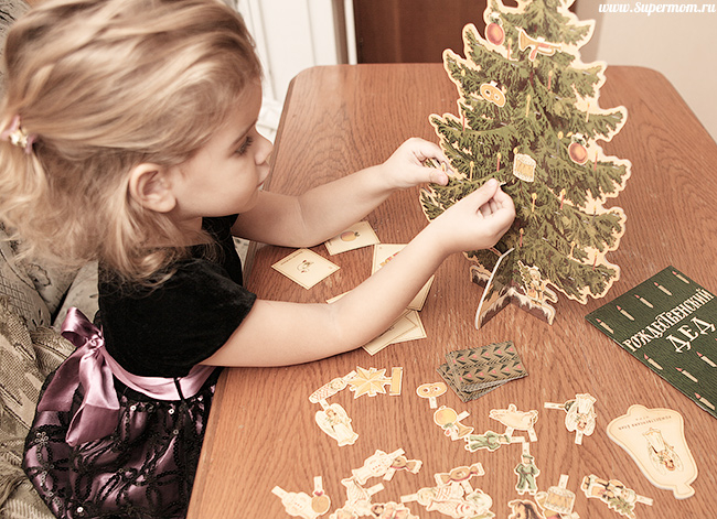 Почему полиграфическая игрушка больше для родителей? К сожалению, прорези для игрушек не продуманы, и при неаккуратном обращении украшения из нее просто-напросто высыпаются. Так что в итоге или мастера-умельцы придумают, как закреплять все это на елке, или украсить, поставить на полку и не дышать. Но красиво - просто сил нет, хоть и картон. Поэтому в качестве подарка, по-моему, просто блеск! Тем более, полиграфия отменная, а конверт с игрой выглядит очень увесисто и внушительно.