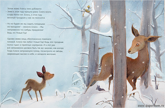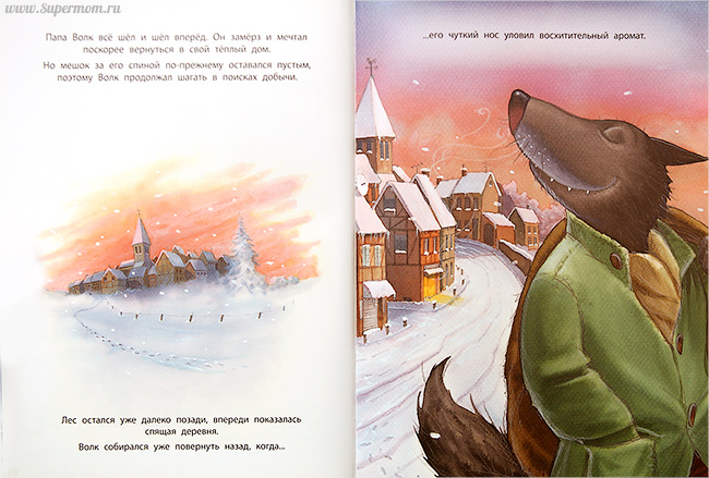 Очень милые акварели и незатейливая добрая рождественская история о том, как злой и страшный папа-волк пошел на охоту, чтобы накормить голодных детишек. Но то ли он был не совсем злым и страшным, то ли на него повлиял праздник, он не смог съесть никого из пойманных им зверей. У зайца дома тоже голодные дети, его жалко, у козлика мама дома мерзнет. Но ведь и у волка есть мама. Как было бы плохо, если бы его мама замерзла. А олень вообще оказался из упряжки Санты, а ведь волчата так ждут подарков.