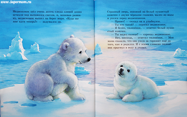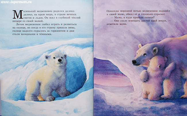 Книга очень незамысловата по своему сюжету, подойдет для чтения самым маленьким детишкам, даже тем, кому еще не исполнилось двух лет. А нарисована она просто потрясающе, вся книга в сине-голубых тонах, и будто светится изнутри! Фото на сайте почему-то вообще не передают этой глубины. А еще она очень похожа на нашу книгу о том, как мамонтенок искал маму, только в конце медвежонок воссоединяется не только с мамой, но и с солнцем.