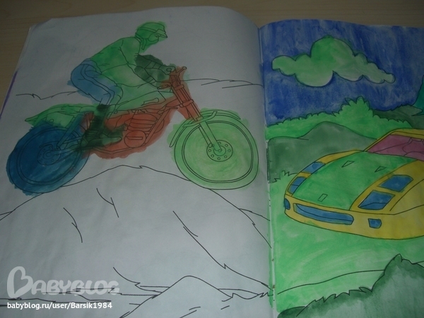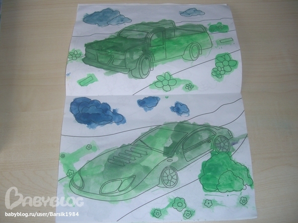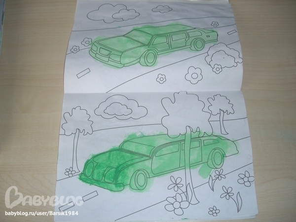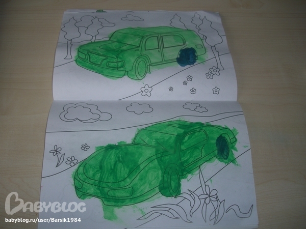 Когда мы вместе рисуем, я края ему обвожу краской, а он раскрашивает. Хорошо получается, за края не попадает. А когда один, то вон мажет немного ))