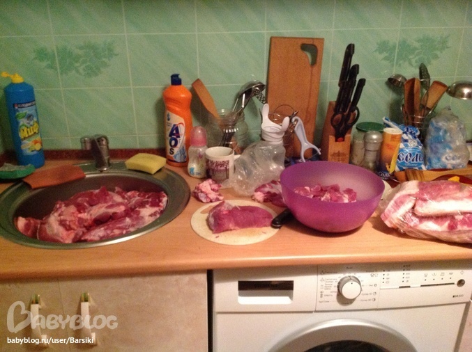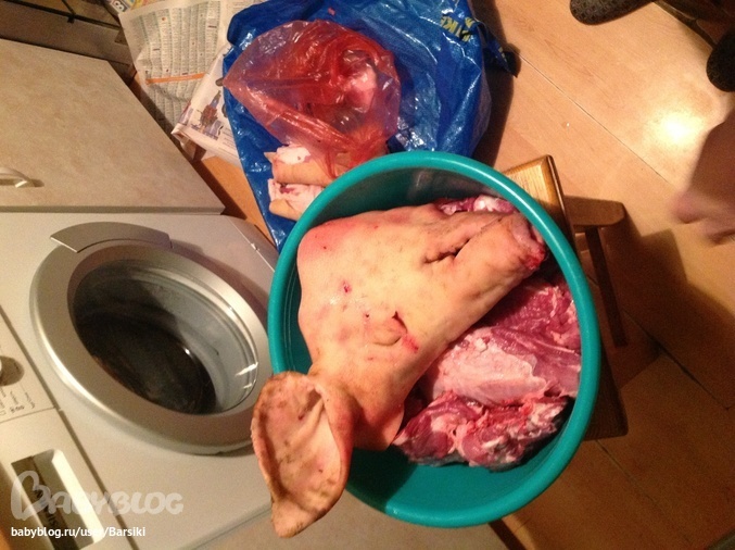 Мне подкинули свинью. Сегодня вечером Сережа ( доброй души человек) привез мне 1/4 свиньи. К чему собственно я оказалась не готова. Кухня быстро превратилась в поле битвы. Топора у нас нет и тесака тоже, вот теперь у меня после этого всего и ножа нет. Морозилка забита, голову завтра на холодец. А вот сало солить я не умею, придется научится. Вообщем мой первый опыт разделки тушки хрюшки )))) фото в комментах ))))