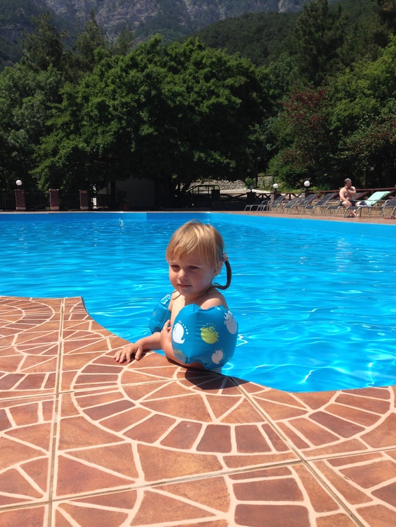 Еще о территории отеля. На самой территории находится бассейн. Плаваешь в нем и любуешься окружающей природой, кайф. Рядом бар, мы в нем обедали, брали борщ с дочкой. Есть две детских площадки. По вечерам детская анимация, сутра зарядка. От отеля идет Боткинская тропа, к сожалению, не удалось по ней пройтись, очень жалею!